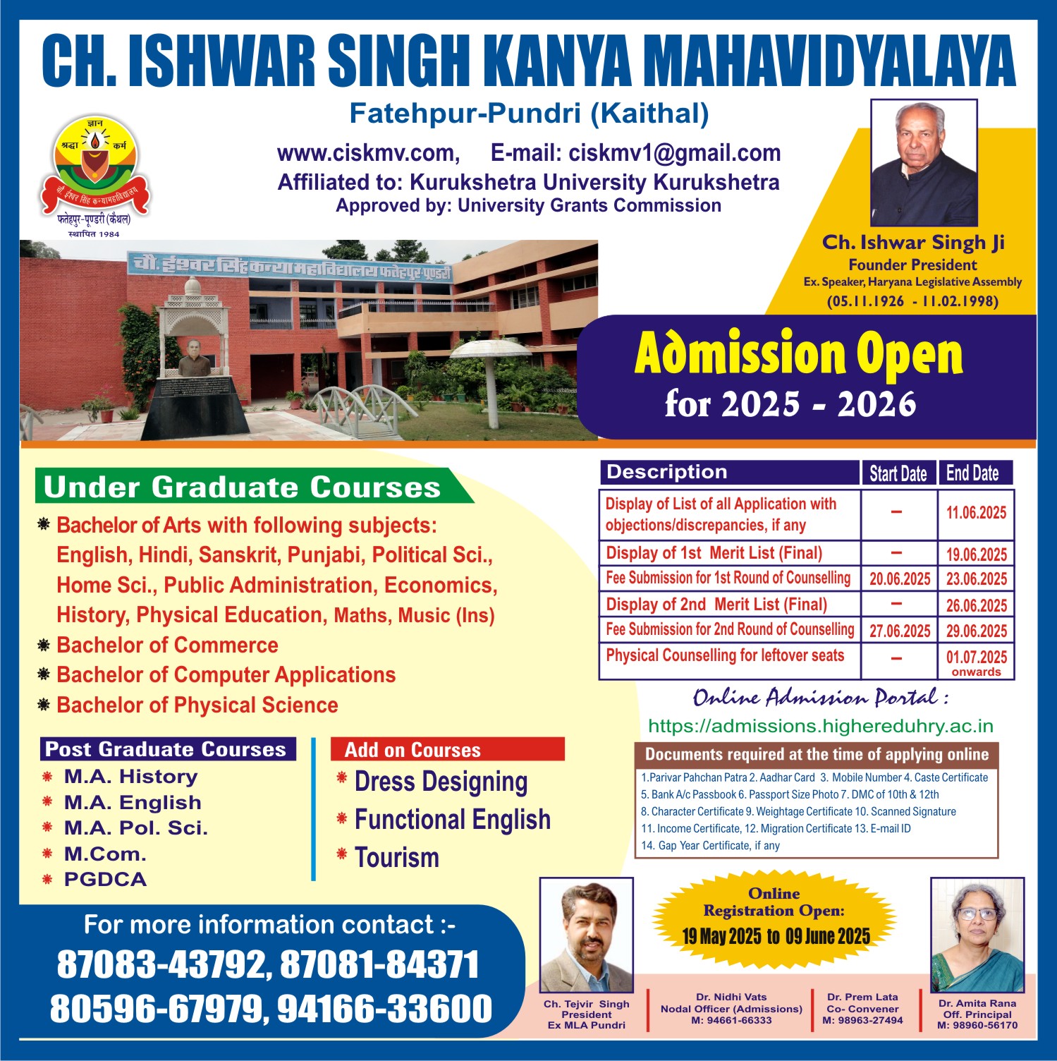 Ch. Ishwar Singh Kanya Mahavidyalaya, Pundri was growing realization of the need of a women institution to quench the educational thirst of woman folk of Pundri and the surrounding rural areas. This dream was ultimately fulfilled in 1984 when the efforts of late Ch. Ishwar Singh Ji and cooperation of the local residents of Fatehpur-Pundri and the surrounding areas fructified into a promising institution then named Kanya Mahavidyalaya, Fatehpur-Pundri. After the death of Ch. Ishwar Singh, the college was renamed as CH. ISHWAR SINGH KANYA MAHAVIDYALAYA.